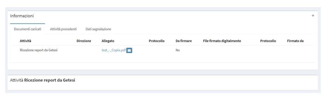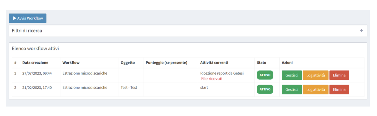 Dopo che un operatore della Getesi avrà effettuato l’evasione del file, verrà invocata l’API del WMS per l’invio del file sul WMS. Da WME questa operazione verrà segnalata nella tabella dei flussi attivi con una label in rosso “File ricevuti”. In questo caso l’utente potrà accedere alla pagina di gestione del flusso e ritrovare nella sezione dei documenti caricati il file lavorato della Getesi da poter consultare e/o scaricare.